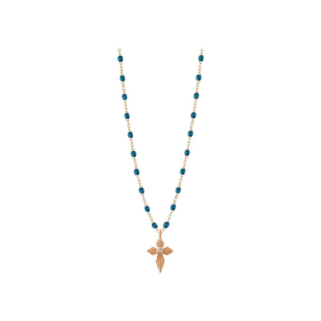 Collier Gigi Clozeau Croix Perlée en or rose, résine bleu prusse et diamants, taille 42cm