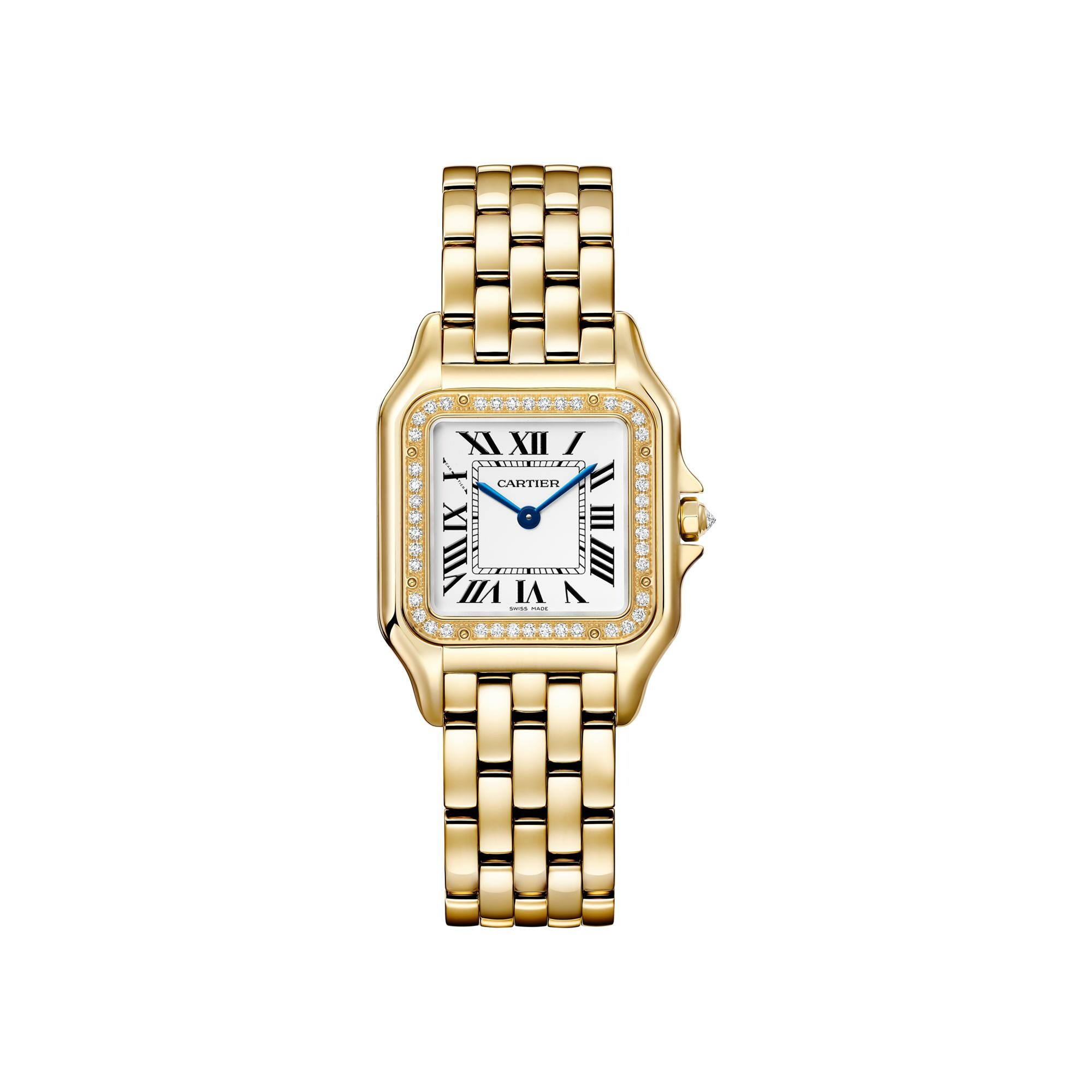 Montre Panthère de Cartier, moyen modèle, mouvement à quartz. Boîte et couronne en or jaune 750/1000 serties de 45 diamants taille brillant pour un total de 0,31 carat. Dimensions : 27 mm x 36 mm, épaisseur : 6 mm, cadran argenté, aiguilles en forme de glaive en acier bleui, bracelet en or jaune 750/1000. Étanche à 3 bar (~30 mètres).
